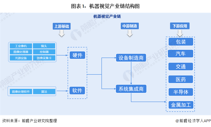 機器視覺產業鏈的上游為光學設備等硬件和圖像處理軟件是機器視覺產業的基礎;中游制造是機器視覺產業鏈的核心,分為設備制造環節和系統集成環節;下游應用領域主要為包裝、人工智能、交通、醫藥、半導體、金屬加工等行業。